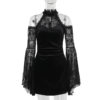 Step into the realm of ethereal elegance with our captivating Gothic Lace Velvet Dress. Its alluring black lace weaves an intricate tapestry that whispers tales of mystery and allure. The slim fit accentuates your curves, creating a silhouette that exudes confidence and sophistication.