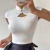 The stand-up collar frames your face like a raven’s wing, casting an air of enigmatic allure. The short sleeves reveal just enough skin to tantalize, while the slim fit accentuates your curves, creating a silhouette that is both alluring and intimidating.